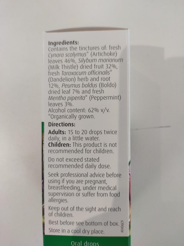 Contains the tinctures of fresh Cynara scolymus* (Artichoke) leaves 46%, Silybum marianum (Milk Thistle) dried fruit 32%, fresh Taraxacum officinalis* (Dandelion) herb and root 12%, Peumus boldus (Boldo) dried leaf 7% and fresh Mentha piperita* (Peppermint) leaves 3%.