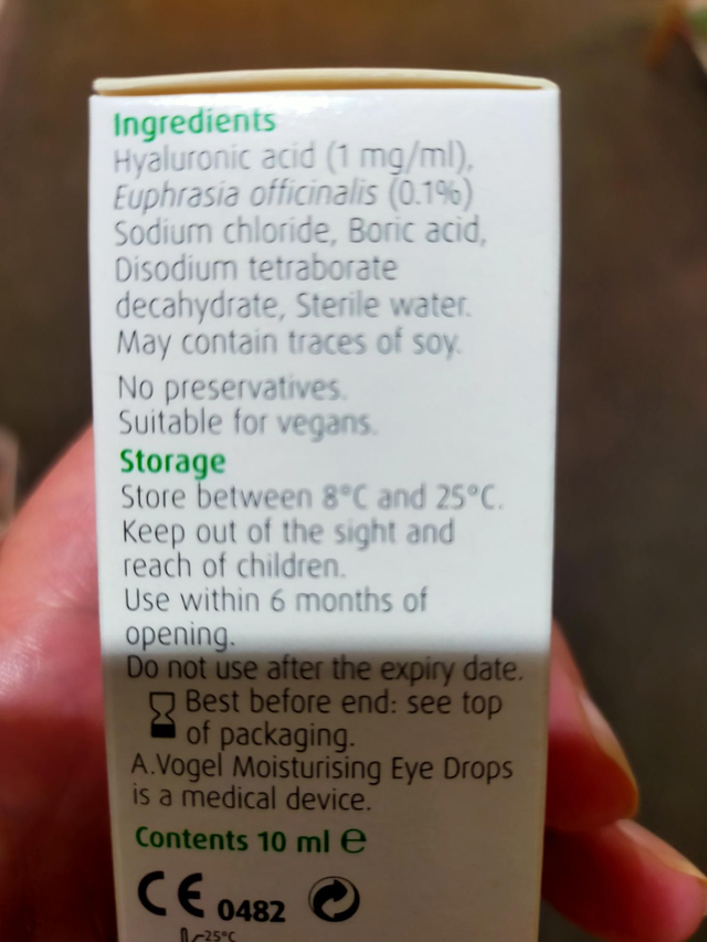 A.Vogel Eye drops contain Hyaluronic acid (1mg/ml ), Euphrasia officinalis (Eyebright), Sodium choloride, Boric acid, disodium tetraborate decahydrate, Sodium hydroxide, Hyaluronic acid and Water.