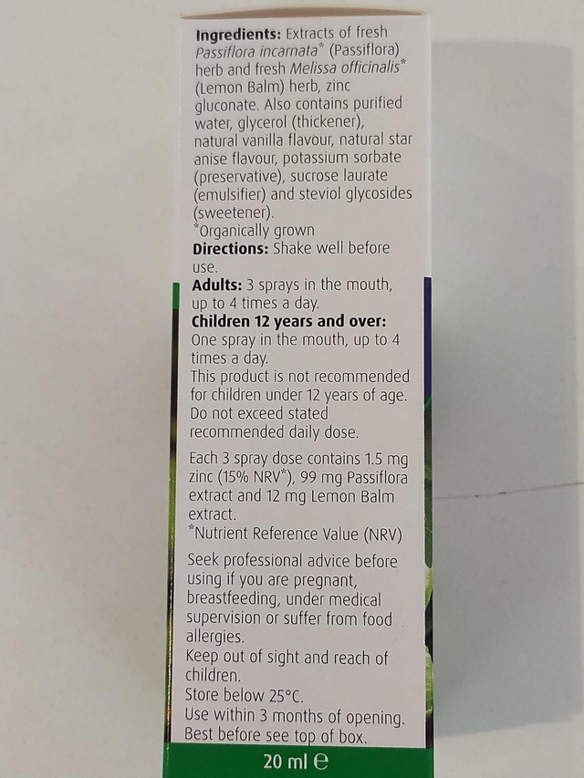 A.Vogel Relax Spray Passiflora Complex contains extracts of Passion Flower & Lemon Balm, as well as Zinc, which protects cells from oxidative stress.