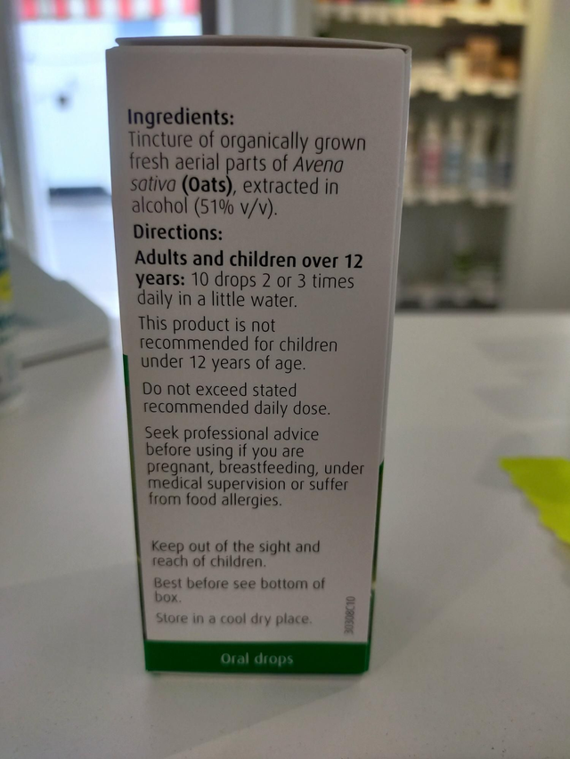 Each ml of oral liquid contains 940mg of tincture from the pressed juice of fresh oat herb (Avena sativa L., herba rec.). Ethanol 51%V/V (43%m/m)