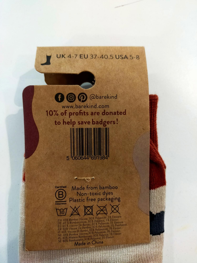 Bare Kind badger bamboo socks, size 4-7.