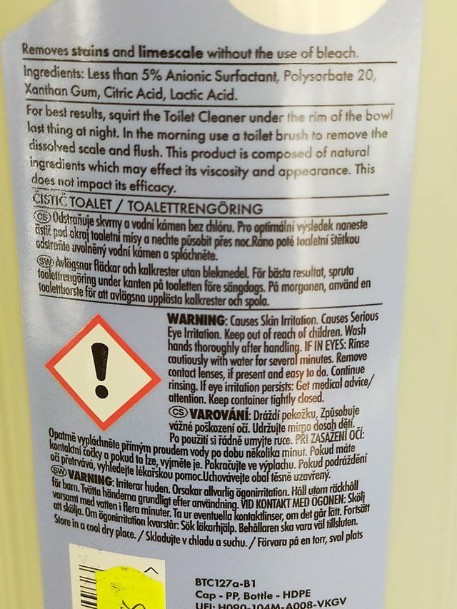 ingredients; Less than 5% Anionic Surfactant, Polysorbate 20, Xanthan Gum, Citric Acid, Lactic Acid pH 3