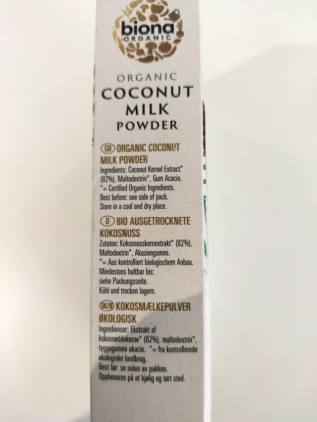 Ingredients, Coconut kernel extract* (82%), maltodextrin*, gum acacia.