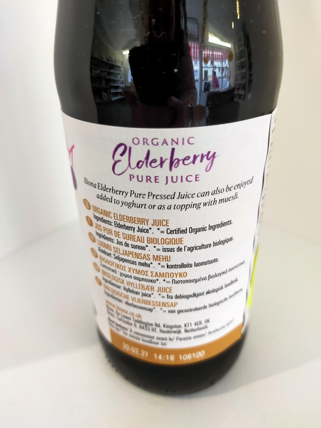 100% Organic Pure Elderberry Juice*. * = Certified Organic Ingredients