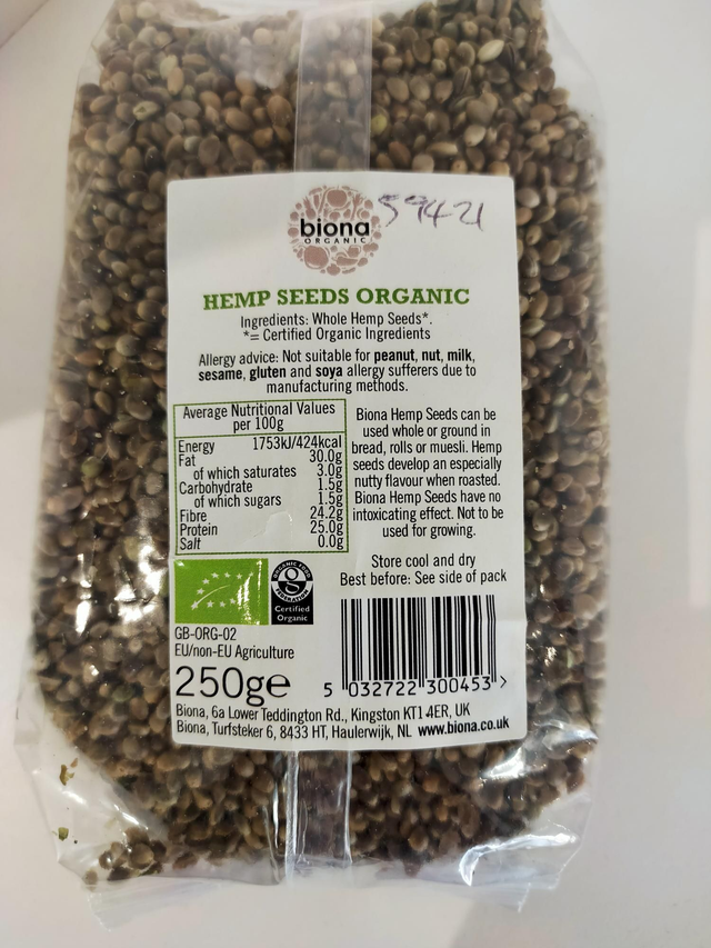 100% Organic Hemp Seeds* * = Certified Organic Ingredients.Not suitable for peanut, nut, milk, sesame, gluten and soya allergy sufferers due to manufacturing methods.