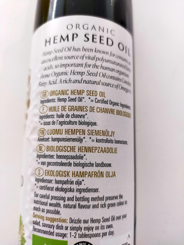 Biona Organic Hemp Seed Oil has a pleasant nutty flavour and is virgin cold pressed to preserve it's nutritional wealth and natural flavour. This healthy oil is ideally suited for use on salads, dips, mayonnaise, on pasta and other vegetable dishes.
