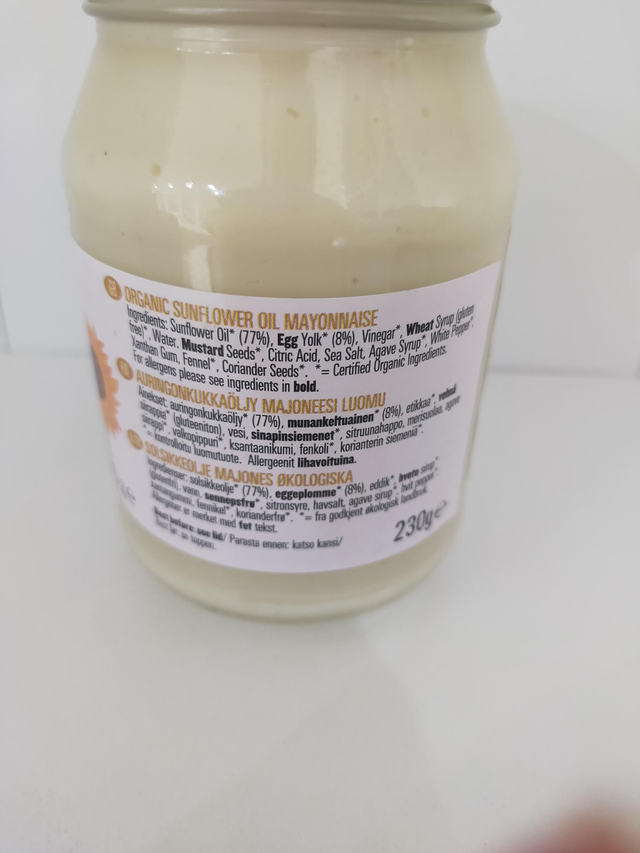 Sunflower Oil* (77%), Egg Yolk* (8%), Vinegar*, Wheat Syrup (gluten free)*, Mustard Seeds*, Citric Acid, Sea Salt, Agave Syrup*, White Pepper*, Xanthan Gum, Fennel*, Coriander Seeds*.