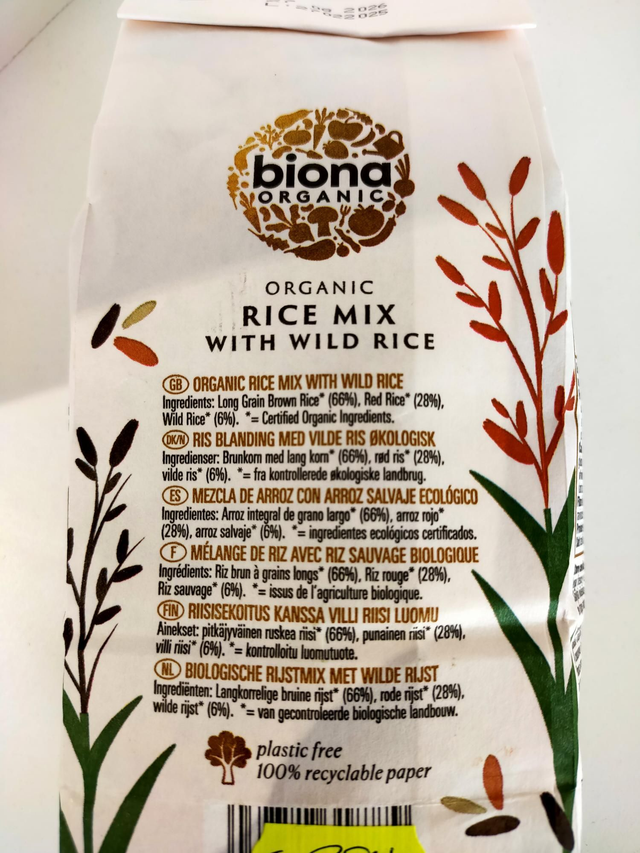 Long Grain Brown Rice* (66%), Red Rice* (28%), Wild Rice*(6%) * = Certified Organic Ingredients