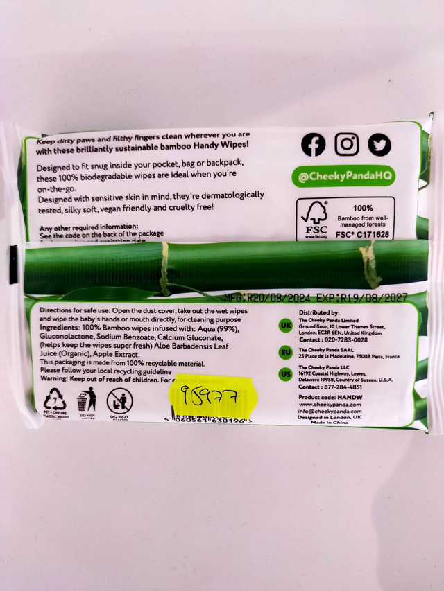 Wipe: 99% purified water with Aloe Vera & fruit extract, Full details: 100% bamboo fibre infused with water (99%), Apple Extract, Aloe Barbadensis Leaf Juice, Gluconolactone, Sodium Benzoate, Calcium Gluconate, Packaging: The packaging of the wipes is made from 3 layers of recyclable material.