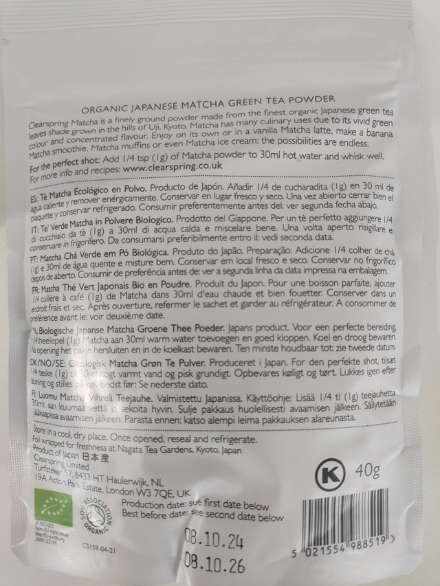 Matcha is a finely milled vibrant green tea powder made from the highest quality Japanese tea leaves. Clearspring Organic Premium Matcha comes from Uji, a region high in the hills around Kyoto, renowned for producing the best Japanese teas. Only accessibly by foot, this remote area is unpolluted and rich in friendly bugs such as spiders, ladybirds, praying mantis and dragonflies to keep the pests under control (best to use organic matcha as non-organic matcha is grown using excessive amounts of agricultural fertilisers and pesticides). Shade grown for the final few months to allow the leaves to fill with chlorophyll, the finest young tea buds are picked, dried and ground in a granite mortar.