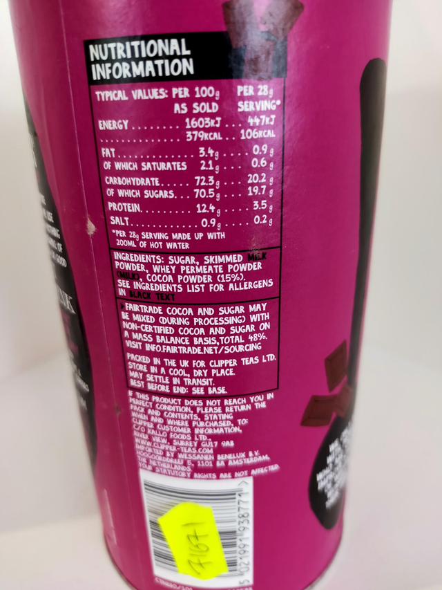 Sugar, skimmed milk powder, whey permeate powder (milk), cocoa powder (15%)