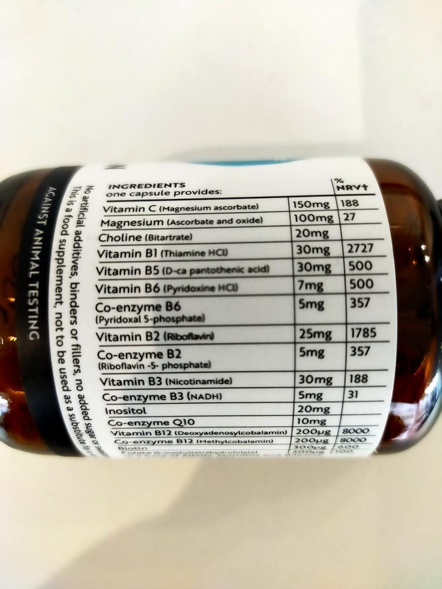 Vitamin C (Magnesium Ascorbate)150mg, Magnesium (Ascorbate and oxide)100mg, Choline (Bitartrate)20mg Vitamin B1 (Thiamine HCl)30mg, Vitamin B5 (D-Ca pantothenic acid)30mg, Vitamin B6 (Pyridoxine HCl)7mg, Co-enzyme B6 (Pyridoxal 5-phosphate 4:1)5mg, Vitamin B2 (Riboflavin)25mg, Co-enzyme B2 (Riboflavin-5-phosphate 5:1)5mg, Vitamin B3 (Nicotinamide)30mg, Co-enzyme B3 (NADH 5:1)5mg, Inositol20mg Co-Q10 (Ubiquinone)10mg Vitamin B12 (Adenosylcobalamin)200µg, Co-enzyme B12 (Methylcobalamin 1:1)200µg, Biotin300µg, Folate (5-methyltetrahydrofolate)200µg In a base of Alfalfa, Spirulina and Bilberry Plant cellulose capsule