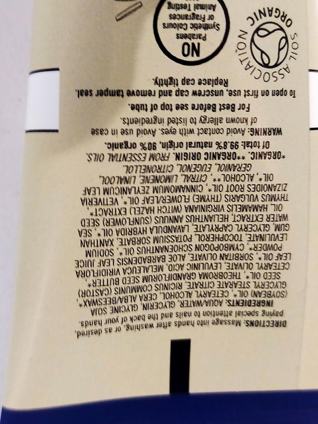 Aqua/Water, Glycerin, Glycine Soja (Soybean) Oil*, Cetearyl Alcohol, Cera Alba/Beeswax*, Glyceryl Stearate Citrate, Ricinus Communis (Castor) Seed Oil*, Theobroma Grandiflorum Seed Butter*, Cetearyl Olivate, Levulinic Acid, Melaleuca Viridiflora Leaf Oil*, Sorbitan Olivate, Aloe Barbadensis Leaf Juice Powder*, Cymbopogon Schoenanthus Oil*, Sodium Levulinate, Tocopherol, Potassium Sorbate, Xanthan Gum, Glyceryl Caprylate, Lavandula Hybrida Oil*, Sea Water Extract, Helianthus Annuus (Sunflower) Seed Oil, Hamamelis Virginiana (Witch Hazel) Extract*, Thymus Vulgaris (Thyme) Flower/Leaf Oil*, Vetiveria Zizanoides Root Oil*, Cinnamomum Zeylanicum Leaf Oil*, Alcohol**,Citral, Limonene, Linalool, Geraniol, Eugenol, Citronellol. *Organic.