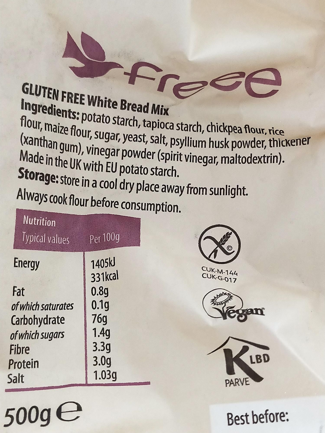 Ingredients; Potato starch, tapioca starch, chickpea flour, rice flour, maize flour, sugar, yeast, salt, psyllium husk powder, thickener (xanthan gum), vinegar powder (spirit vinegar, maltodextrin).