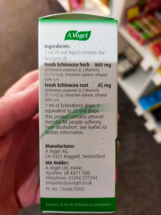 1 ml of oral liquid contains the tinctures of: Fresh Echinacea herb (Echinacea purpurea (L) Moench) (1:7.5-14.6) 860 mg. Extraction solvent: ethanol 65% v/v Fresh Echinacea root (Echinacea purpurea (L) Moench) (1:7.1-12.5) 45 mg. Extraction solvent: ethanol 65% v/v. 1 ml of Echinaforce is equivalent to 25 oral drops. The other ingredients used for the liquid are ethanol.