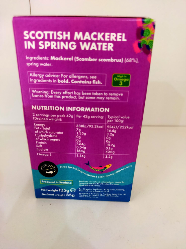 Ingredients: Mackerel (Scomber Scombrus) (68%), Spring water
