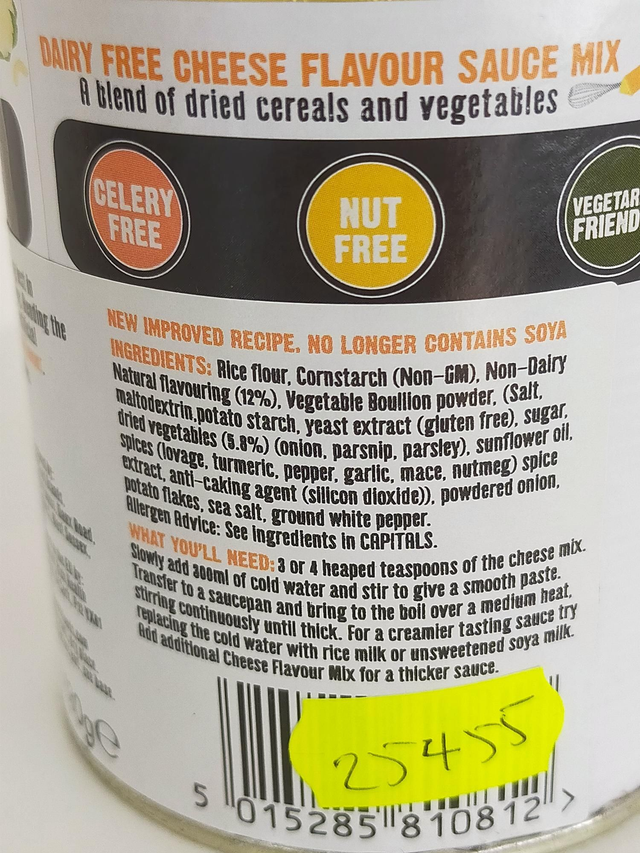 Rice Flour, Cornstarch (Non-GM), Non-Dairy Cheese Flavouring (12%) (contains Soya), Vegetable Bouillon Powder (contains: Salt, Maltodextrin, Potato Starch, Yeast Extract (Gluten Free), Sugar, Vegetables (5.8%) (Onion, Parsnip, Parsley), Sunflower Oil, Spices, (Lovage, Turmeric, Pepper, Garlic, Mace, Nutmeg), Spice Extract, Anti-Caking Agent (Silicon Dioxide)), Powdered Onion, Potato Flakes, Sea Salt, Ground White Pepper