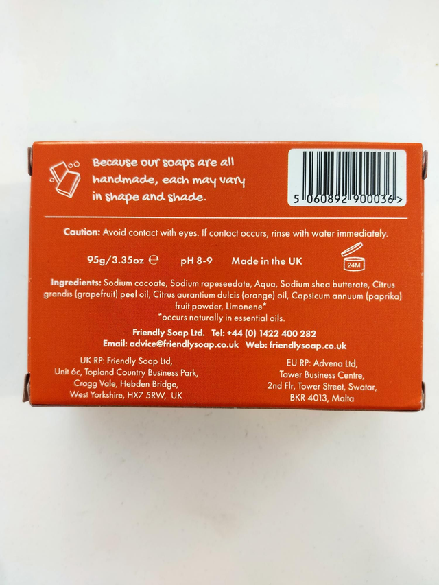 Ingredients: Sodium cocoate, Sodium rapeseedate, Aqua, Sodium shea butterate, Citrus grandis (grapefruit) peel oil, Citrus aurantium dulcis (orange) oil, Capsicum annuum (paprika) fruit powder, Limonene*