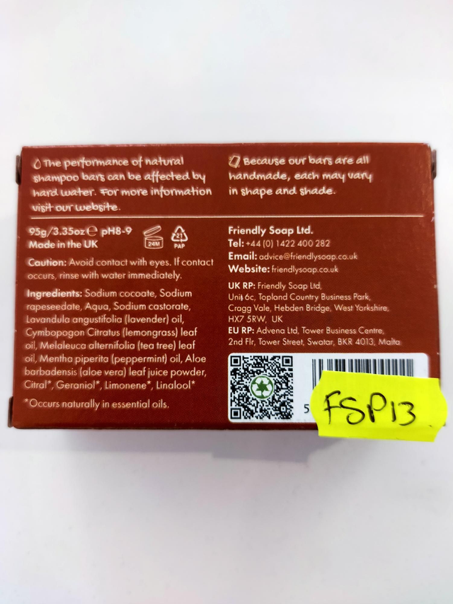 Ingredients: Sodium cocoate, Sodium rapeseedate, Aqua, Sodium castorate, Lavandula angustifolia (lavender) oil, Cymbopogon Citratus (lemongrass) leaf oil, Melaleuca alternifolia (tea tree) leaf oil, Mentha piperita (peppermint) oil, Aloe barbadensis (aloe vera) leaf juice powder, Citral*, Geraniol*, Limonene*, Linalool* *occurs naturally in essential oils.
