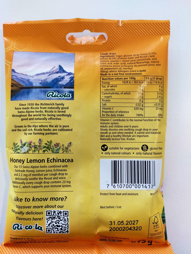 Sugar, glucose syrup, Fair Trade honey (5.1%), extract (0.5%) of Ricola's herb mixture, vitamin C, lemon juice concentrate, acid (citric acid, malic acid), natural flavourings, natural echinacea aroma (echinacea dry pressed juice), mint oil, peppermint oil, menthol.