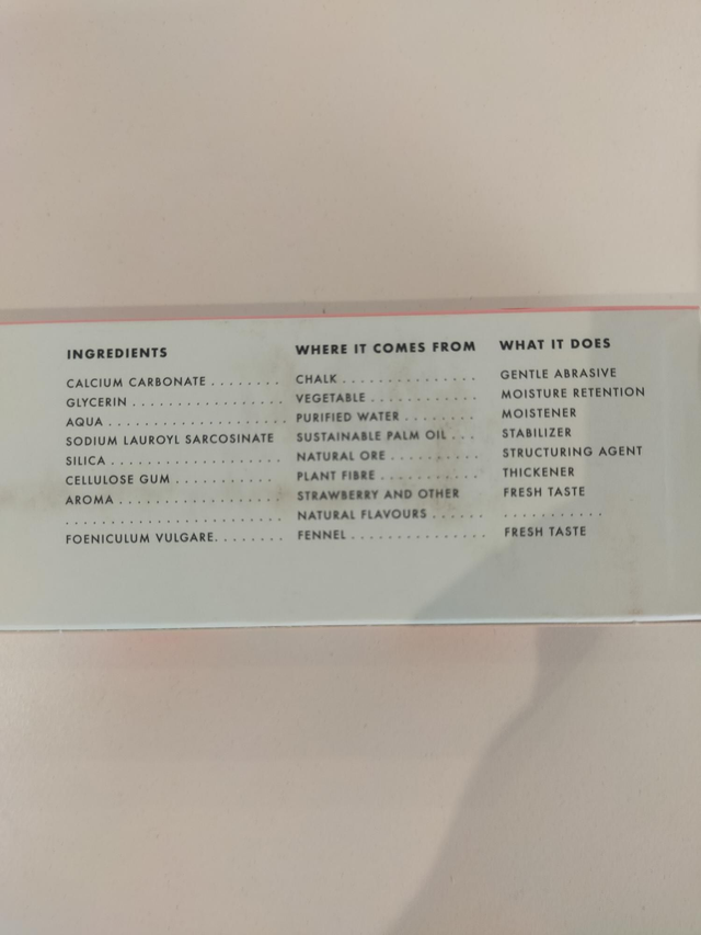 Calcium carbonate, glycerin, aqua, sodium lauroyl sarcosinate, hydrated silica, cellulose gum, aroma, foeniculum vulgare, limonene.