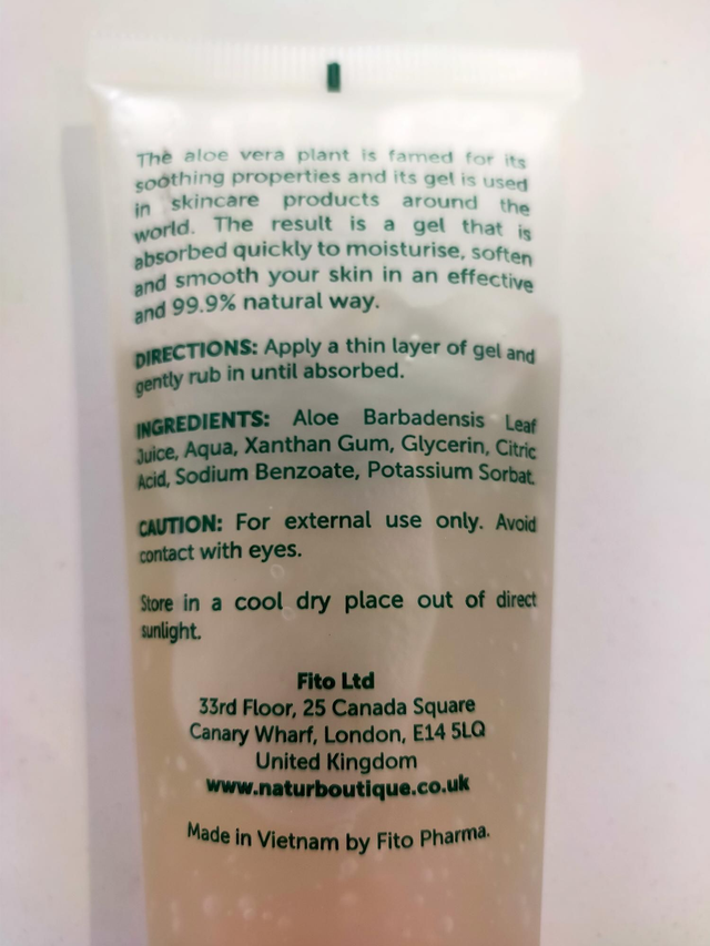 Ingredients: Aloe Barbadensis leaf Juice, Aqua, Xanthan Gum, Glycerin, citric Acid, Sodium Benzoate, potassium sorbat