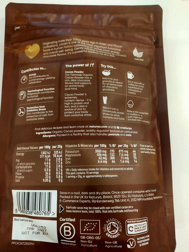 Ingredients; 100% Organic Fairtrade Cacao