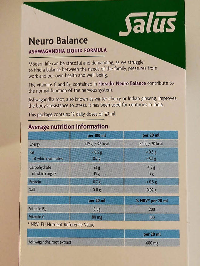 Aqueous herbal extract (37%) from: lemon balm leaf (Melissa officinalis), lavendar flower (Lavandula angustifolia), peppermint leaf (Mentha x piperita), passion flower herb (Passiflora incarnata), rosemary leaf (Rosmarinus officinalis). Mixture of fruit juice concentrates (26%) of: pear, pineapple, orange, passion fruit, lemon apple. Water, mango puree, guava puree, ashwagandha extract (Withania somnifera), vitamin C (L-ascorbic acid), carob extract, stabilizer (locust bean gum), natural flavours, vitamin B12 (methylcobalamin).