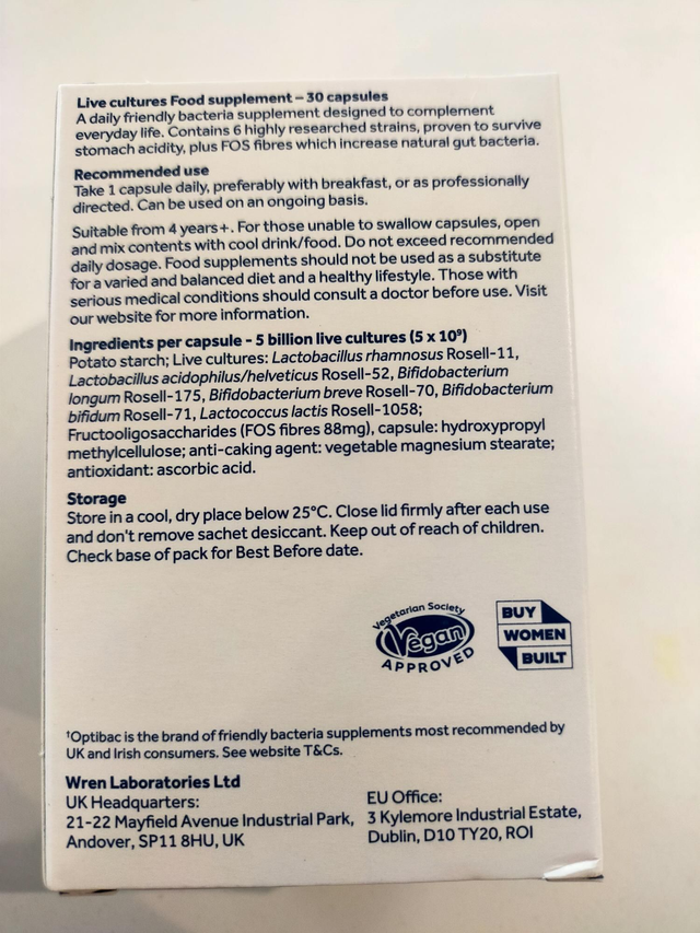 Optibac Every Day is guaranteed to provide a daily dose of 5 billion live cultures. The natural bacteria in this product are combined with Fructooligosaccharide (FOS) fibres.