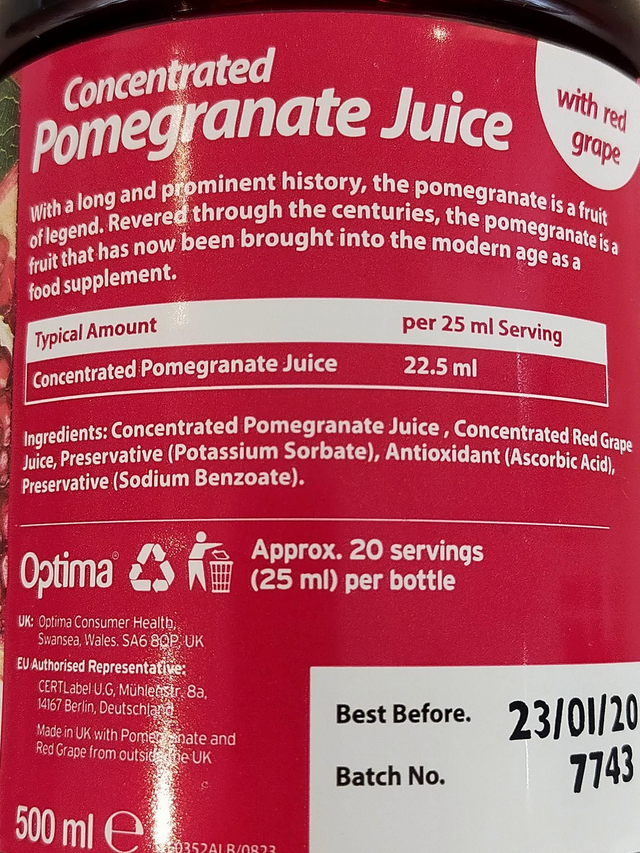 Ingredients: Pomegranate Juice from Concentrate, Red Grape Juice Concentrate, Preservative (Potassium Sorbate), Antioxidant (Ascorbic Acid), Preservative (Sodium Benzoate)