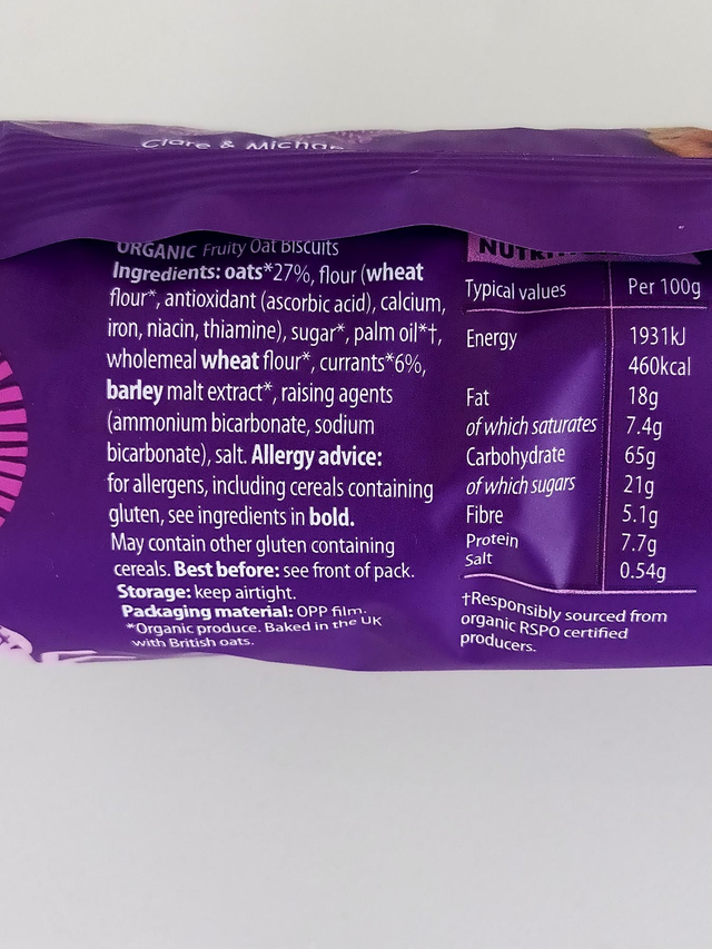 Oats*27%, flour*(wheat flour*, antioxidant (ascorbic acid), calcium, iron, niacin, thiamine), sugar*, palm oil*+, wholemeal wheat flour*, currants* 6%, barley malt extract*, raising agents (ammonium bicarbonate, sodium bicarbonate), salt.