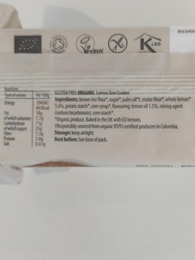 brown rice flour*, sugar*, palm oil*, maize flour*, whole lemon*5.6%, potato starch*, corn syrup*, flavouring: lemon oil 1.5%, raising agent (sodium bicarbonate), corn starch*.