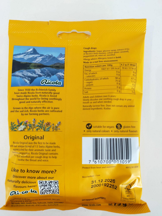 Each cough drop contains the Ricola 13 herb blend to which we add ingredients like Fair Trade honey, lemon juice, peppermint oil and natural menthol to give your throat the extra care it needs.