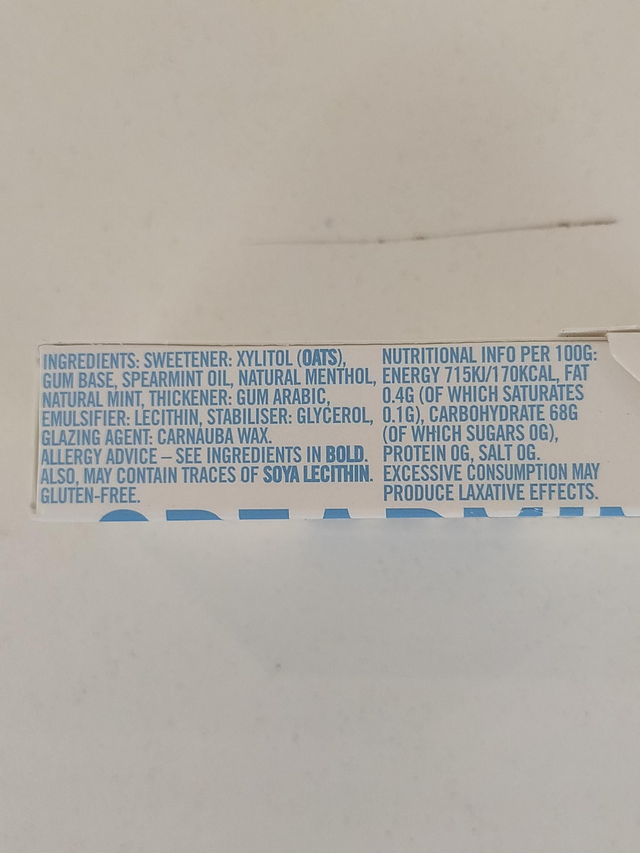 Sweetener: xylitol (oats), gum base, spearmint oil, natural menthol, natural mint, thickener: gum arabic, emulsifier: lecithin, stabiliser: glycerol, glazing agent: carnauba wax.