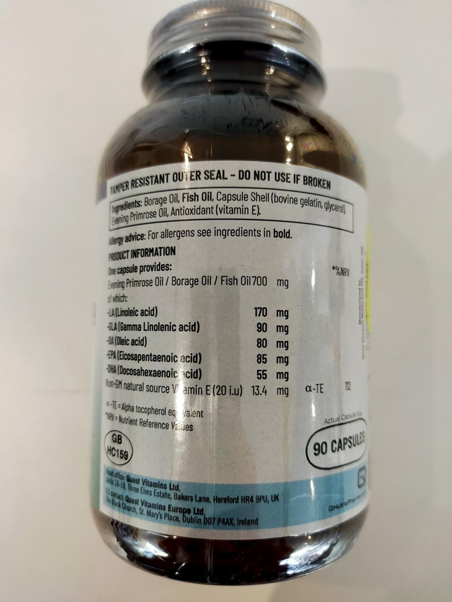 A balanced blend of Omega 3,6 and 9 fatty acids, contains omega 6 fatty acids gamma linolenic acid (GLA) and linoleic acid (LA) from evening primrose and borage oils combined with omega 3 fatty acids eicosapentaenoic acid (EPA) and docosahexaenoic acid (DHA) from fish oil. Also naturally contains the omega 9 fatty acid oleic acid.