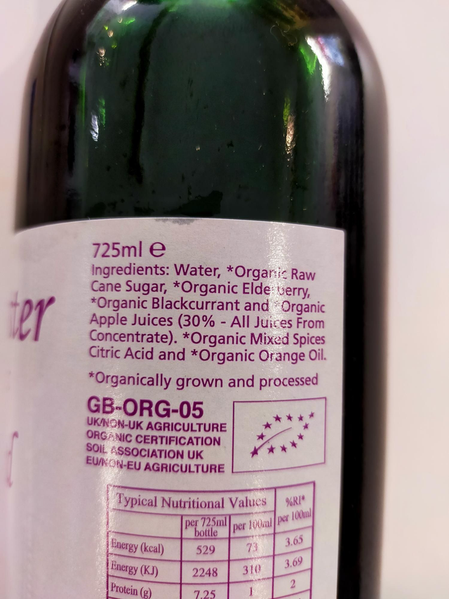 Ingredients; Water, Organic Raw Cane Sugar, Organic Elderberry, Organic Blackcurrant and Organic Apple Juices (30% - All Juices from Concentrate), Organic Mixed Spices, Citric Acid and Organic Orange Oil