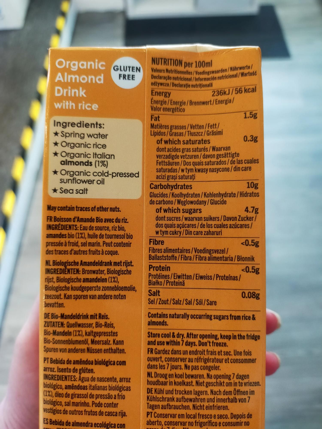Natural spring water, organic rice (14%), organic italian almonds (1%), organic cold-pressed sunflower oil, sea salt.