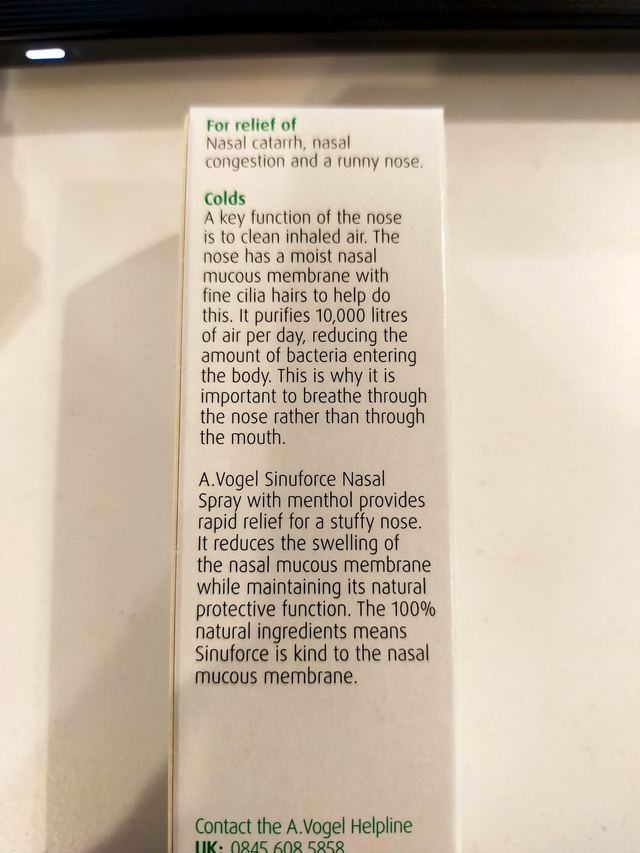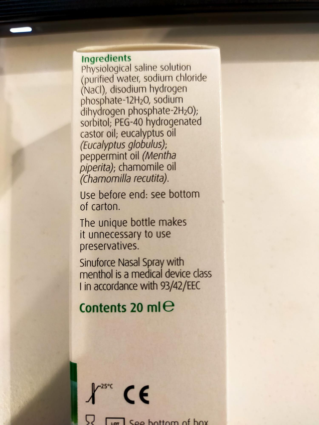 Sinuforce Nasal Spray with menthol also contains peppermint oil and eucalyptus oil to ease breathing, and chamomile oil which has a soothing effect on your nose.