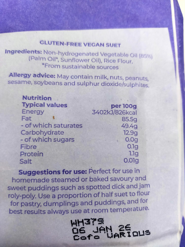 This gluten free vegetarian suet from Suma is perfect for homemade steamed or baked savoury and sweet puddings, such as spotted dick and jam roly-poly.