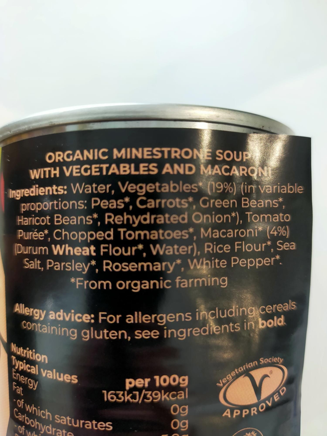 Water, vegetables*(20%) (in variable proportions: green beans*, carrots*, kale*, haricot beans*, rehydrated onion*), chopped tomatoes*, tomato puree*, sunflower oil*, macaroni elbows* (4%)(durum wheat flour, water), rice flour*, vegetable bouillon*(rice flour*, sea salt, yeast extract, dried vegetables & concentrated vegetable juices* (onion*, carrot*, parsnip*, mushroom*, pumpkin*), sunflower oil*, turmeric*, parsley*, lovage*, garlic*, fennel seeds*), basil*, onion powder*, ground bay leaf*, parsley*, rosemary*, nutmeg*, white pepper*.
