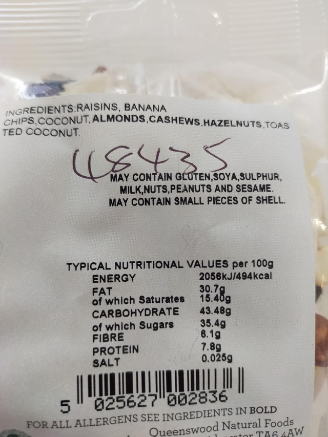 Ingredients, raisins, banana chips, coconut, almonds, cashews, hazelnuts, toasted coconut.