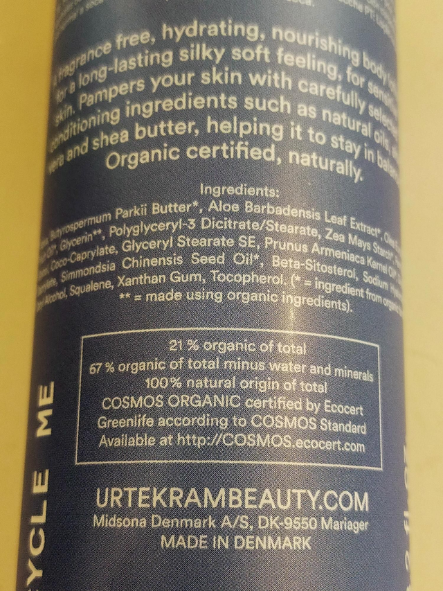 Ingredients: Aqua, Butyrospermum Parkii Butter*, Aloe Barbadensis Leaf Extract*, Olea Europaea Fruit Oil*, Glycerin**, Polyglyceryl-3 Dicitrate/Stearate, Zea Mays Starch*, Coco-Caprylate, Glyceryl Stearate SE, Glyceryl Caprylate, Prunus Armeniaca Kernel Oil*, Simmondsia Chinensis Seed Oil*, Beta-Sitosterol, Sodium Hyaluronate, Cetyl Alcohol, Squalene, Xanthan Gum, Tocopherol. (* = ingredient from organic farming, ** = made using organic ingredients). 21 % organic of total. 67 % organic of total minus water and minerals. 100% natural origin of total. COSMOS ORGANIC certified by Ecocert Greenlife according to COSMOS Standard.