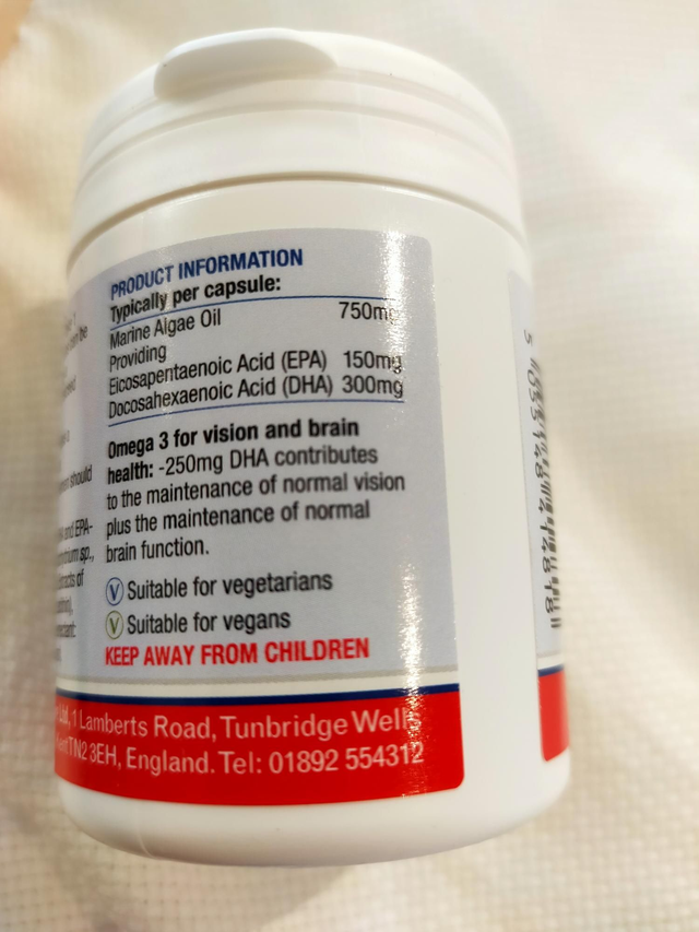 With: Algal Oil (Rosemary (Rosmarinus officinalis) Leaf Extract & Natural mixed Tocopherols, DHA rich oil from the Schizochytrium sp., Sunflower Lecithin), Capsule Shell (Modified Starch, Glycerol, Gelling Agent: Carrageenan, Acidity Regulator: Sodium Carbonate).