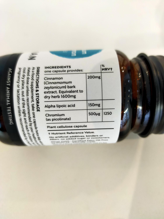 Ingredients: Chromium (as picolinate), Ceylon cinnamon bark extract (Cinnamomum zeylanicum), Alpha lipoic acid, Vegan capsule.