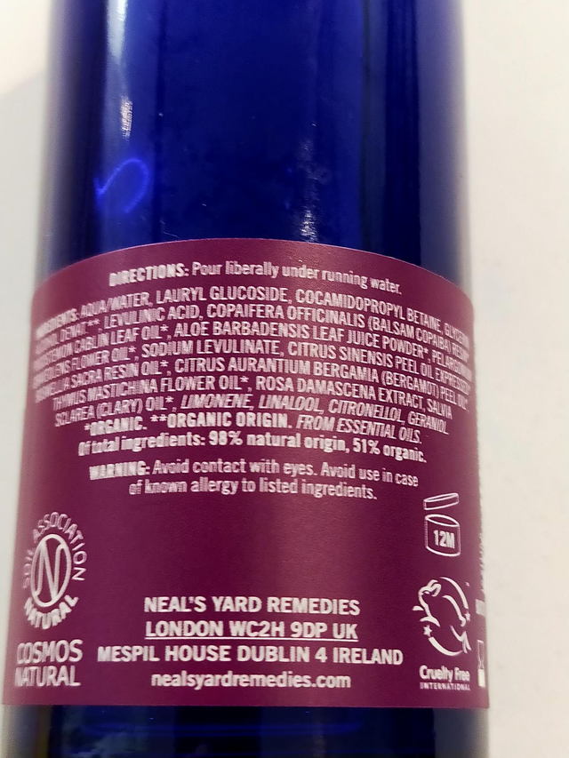 Water, Lauryl Glucoside, Cocamidopropyl Betaine, Glycerin, Alcohol Denat.**, Levulinic Acid, Copaifera Officinalis (Balsam Copaiba) Resin*, Pogostemon Cablin Leaf Oil*, Aloe Barbadensis Leaf Juice Powder*, Pelargonium Graveolens Flower Oil*, Sodium Levulinate, Citrus Sinensis Peel Oil Expressed*, Boswellia Sacra Resin Oil*, Citrus Aurantium Bergamia (Bergamot) Peel Oil*, Thymus Mastichina Flower Oil*, Rosa Damascena Extract, Salvia Sclarea (Clary) Oil*, Limonene, Linalool, Citronellol, Geraniol. *Organic. **Organic Origin. From Essential Oils.