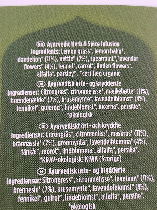 Lemon grass*, lemon balm*, dandelion*, nettle*, spearmint*, lavender flowers*, fennel*, carrot*, linden flowers*, alfalfa*, parsley*. *certified organic