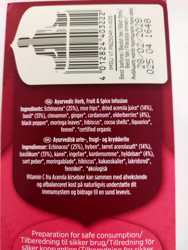 Ingredients; Echinacea*, rose hips*, dried acerola juice*, basil*, cinnamon*, ginger*, cardamom*, elderberries*, black pepper*, moringa leaves*, hibiscus*, cocoa shells*, liquorice*, fennel*. *certified organic