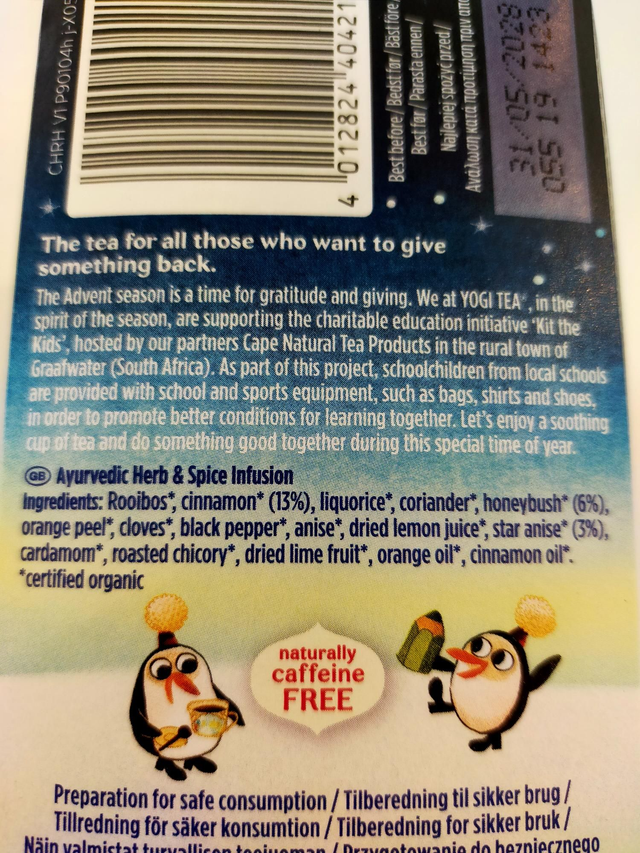 Rooibos*, cinnamon* (13%), liquorice*, coriander*, honeybush* (6%), orange peel*, cloves*, black pepper*, anise*, dried lemon juice*, star anise* (3%), cardamom*, roasted chicory*, lime*, orange oil*, cinnamon oil*. *certified organic