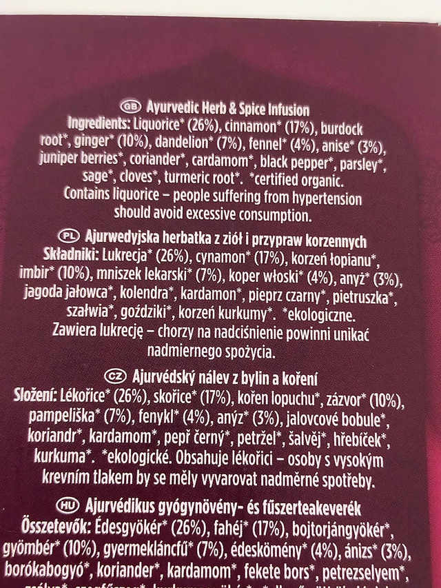 Liquorice*, cinnamon*, burdock root*, ginger*, dandelion*, fennel*, anise*, juniper berries*, coriander*, cardamom*, black pepper*, parsley*, sage*, cloves*, turmeric root*. *certified organic